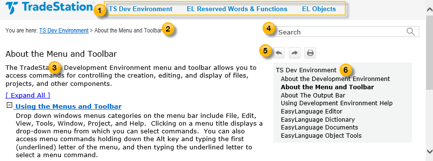 The help topic displays information about the feature selected from the TradeStationplatform or a topic that you located using the navigation menus or Search.